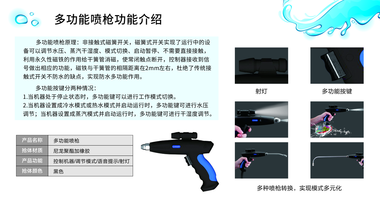 自帶的尼龍聚酯獨立控制噴槍設計輕巧大方,單手可握。采用非接觸式磁簧開關,無需直接接觸,利用永久性磁鐵的作用給干簧管消磁,使其常閉觸點斷開,遠程控制設備,可調節(jié)水壓、蒸汽干濕度、模式切換、啟動暫停。獨一無二的射燈照明設計,即便是躲在暗處的污垢油漬,也無處可逃。