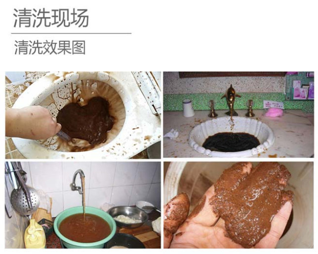 上圖是管凈康的現(xiàn)場清洗效果圖,可以看出大部分都是清洗的較為老舊的房子,清洗出來的淤泥比較多。