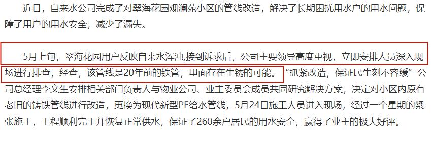 為減少管道二次污染對(duì)生活的影響,各地的水務(wù)局在夏季用水高峰期來臨之前,對(duì)公共自來水管進(jìn)行排查、改造更換和維修。以便能更好的提升居民用水質(zhì)量,保障健康用水。